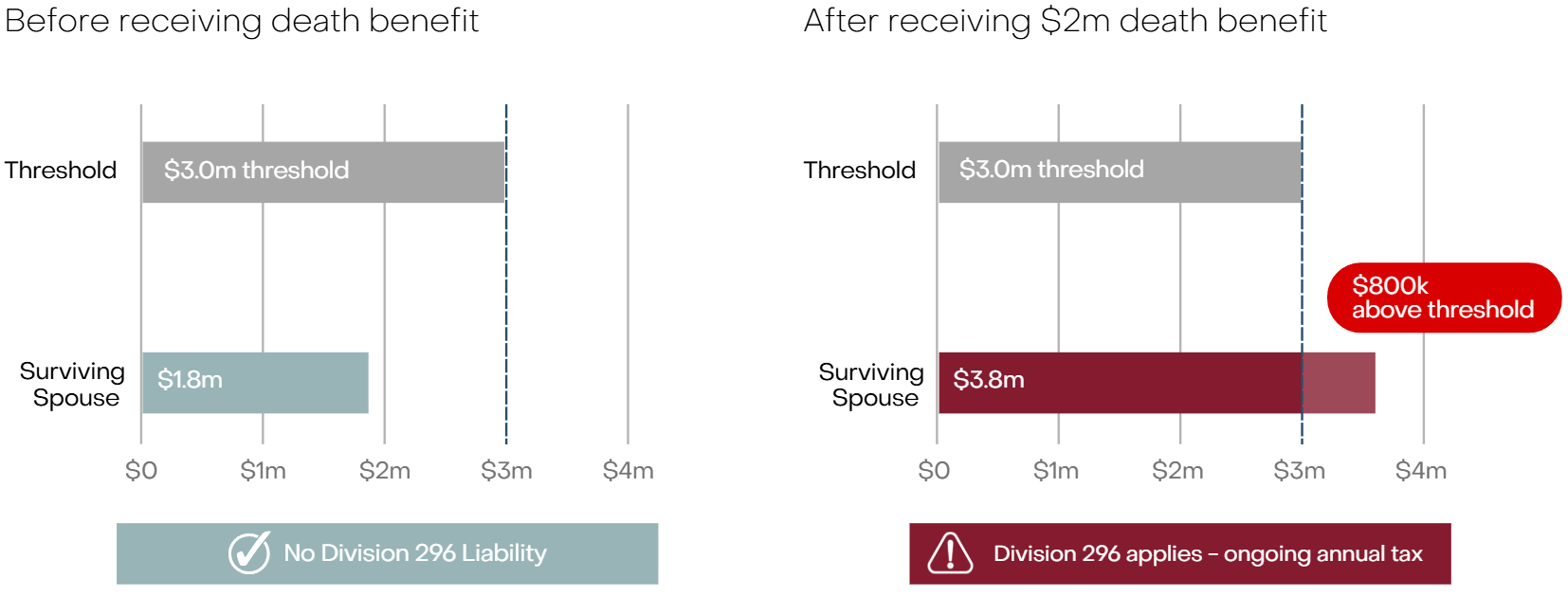 In the example below, a surviving spouse with $1.8 million in super receives a $2 million death benefit. Their TSB rises to $3.8 million placing $800,000 above the threshold. Each year, Division 296 tax will apply to the earnings attributable to that excess.