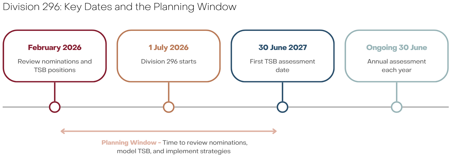 TSB is measured at 30 June each year. A death benefit received and counted before 30 June will be included in the survivor’s TSB at that date, which then informs the following financial year’s Division 296 assessment. With Division 296 commencing on 1 July 2026, the first relevant measurement date will be 30 June 2027.