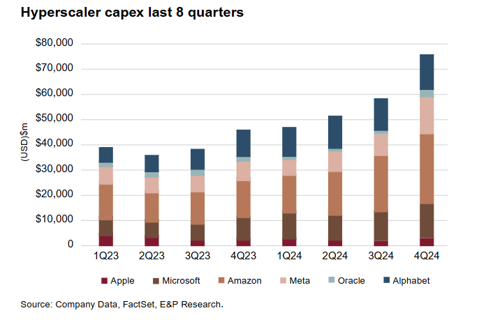 Whilst there have been reports of hyperscalers such as Microsoft potentially cancelling data center leases and slowing international growth, the data tells us that all the hyperscalers have been spending record capex on data centers and compute capacity, and guiding to further growth in 2025. All hyperscalers reported infrastructure capacity constraints as holding back further AI growth, and an inability to meet current demand for AI services. Commentary from the hyperscalers has indicated substantial end-user adoption and utilisation as well, meaning that the revenue streams supporting the major capex expansions look fundamentally robust and sustainable. Following record capex spending in 2024, we expect hyperscaler capex to rise 40% in 2025.